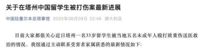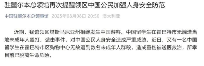 据此前报道,8月8日晚,“中国驻墨尔本总领事馆”官微发文提醒领区中国公民加强人身安全防范。文章提到,近日,又有一名中国留学生在霍巴特市区购物中心无故遭到数名未成年人群殴,造成重伤被送医救治,所幸目前已脱离生命危险。